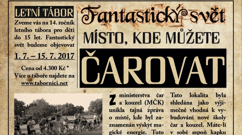 14. ročník našeho velkolepého letního tábora nese téma „Fantastický svět“. Bude se konat už tradičně první 2 týdny v červenci v Kořeni u Konstantinových lázní. V rámci celotáborové hry budeme stavět svou vlastní kouzelnickou školu. Přihlášky už byly spuštěny a místa se rychle obsazují. Těšíme se na vás!!