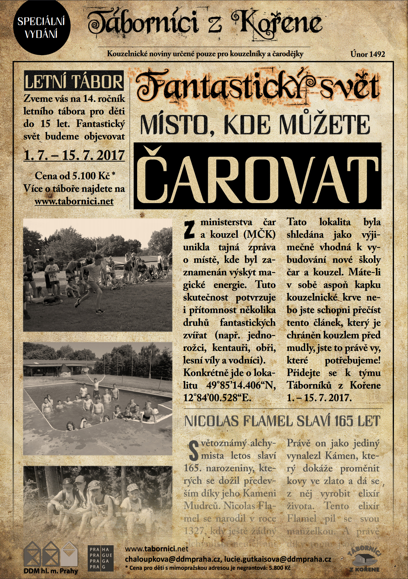 14. ročník našeho velkolepého letního tábora nese téma „Fantastický svět“. Bude se konat už tradičně první 2 týdny v červenci v Kořeni u Konstantinových lázní. V rámci celotáborové hry budeme stavět svou vlastní kouzelnickou školu. Přihlášky už byly spuštěny a místa se rychle obsazují. Těšíme se na vás!!