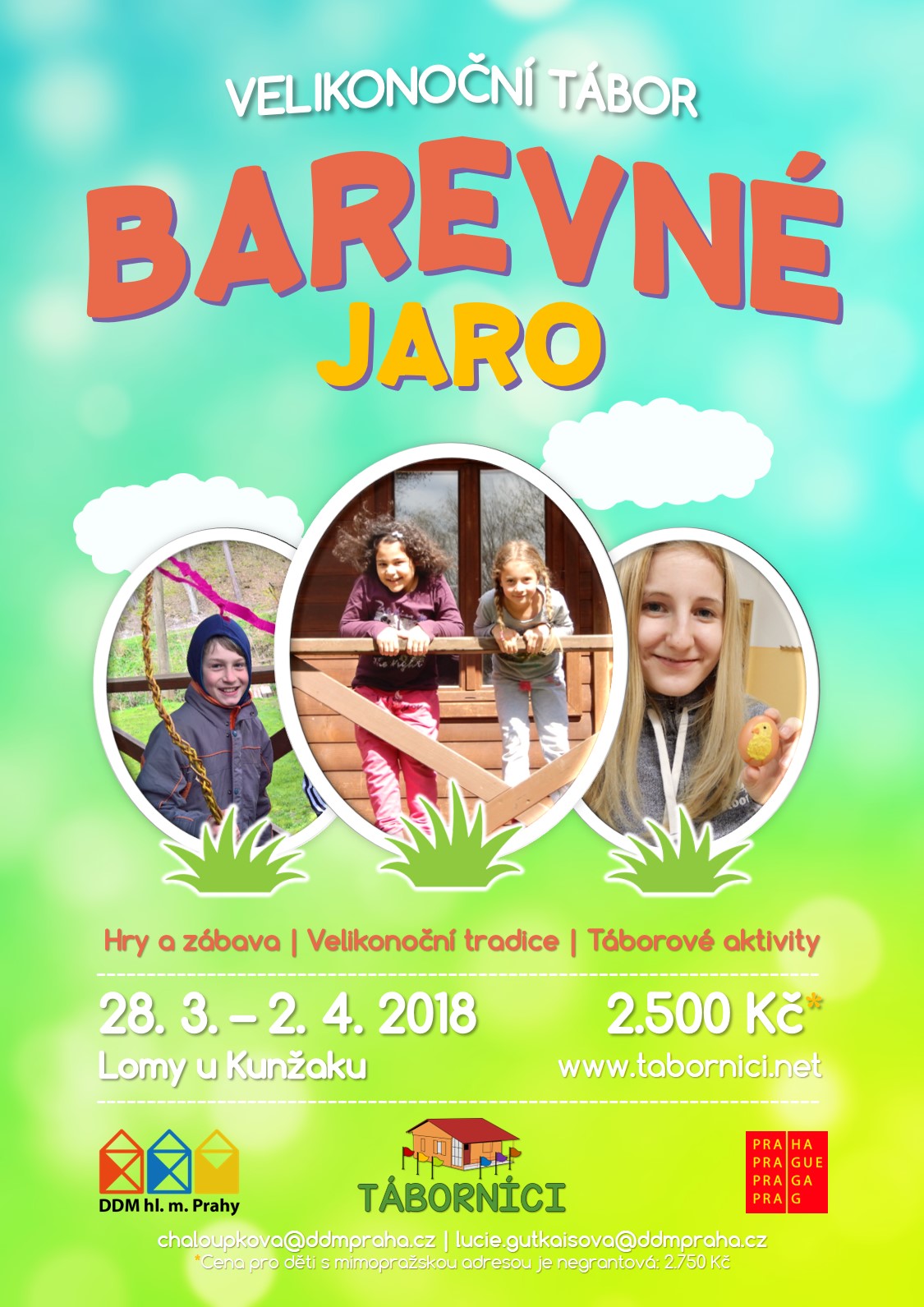 Pro velký úspěch pro vás připravujeme i letos velikonoční tábor s tradičním názvem „Barevné jaro“, který proběhne o velikonočních prázdninách 28. března - 2. dubna 2018 v Lomech u Kunžaku. Těšit se můžete na bohatý program plný zábavy a velikonočních zvyků.